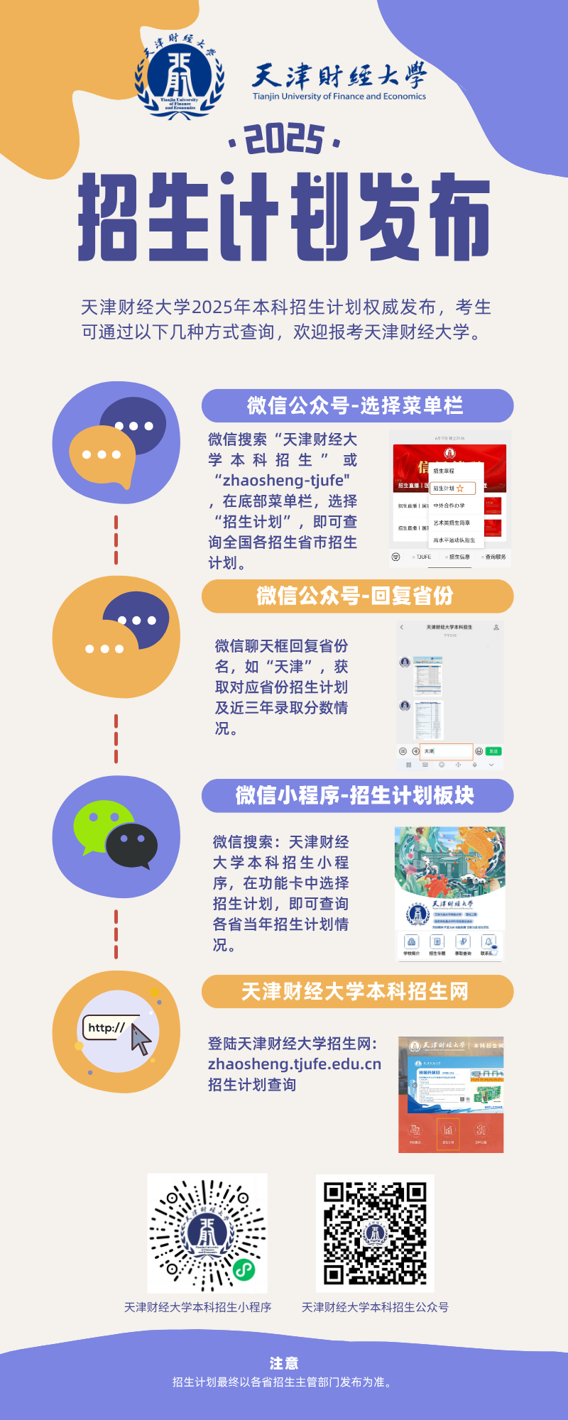 学校招生计划同时通过天津财经大学本科招生网以及各省招办官方网站对外发布。